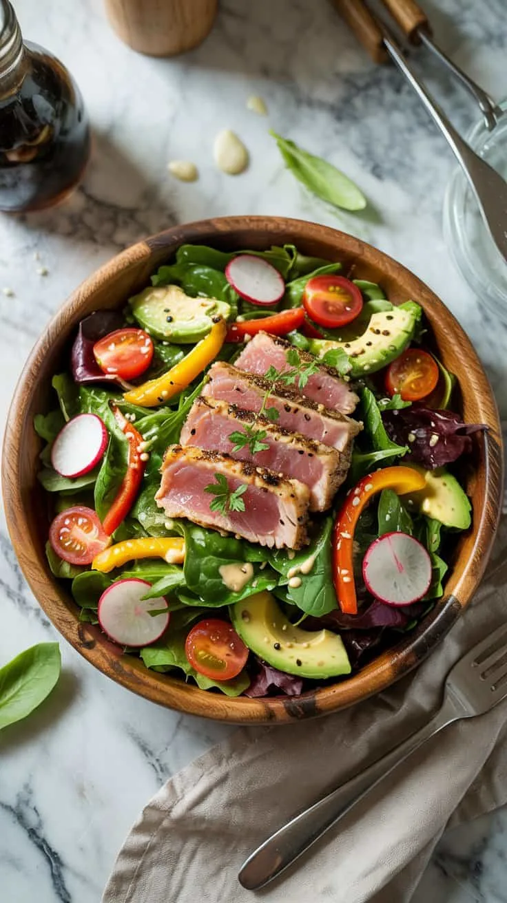 - Assemble the Salad – Toss the mixed greens, sliced cucumber, and avocado in a light drizzle of the prepared dressing. Arrange the tuna slices on top, sprinkle with toasted sesame seeds, and optionally garnish with fresh herbs like cilantro or scallions for extra brightness.