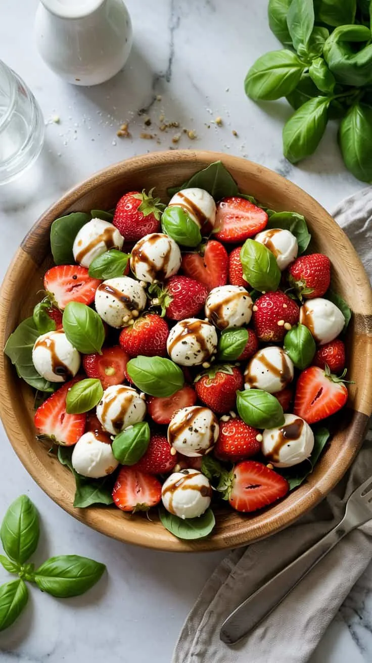 - Assemble the Salad – Combine sliced strawberries, torn basil, and fresh mozzarella pieces in a large bowl. Drizzle dressing and toss gently to coat evenly.