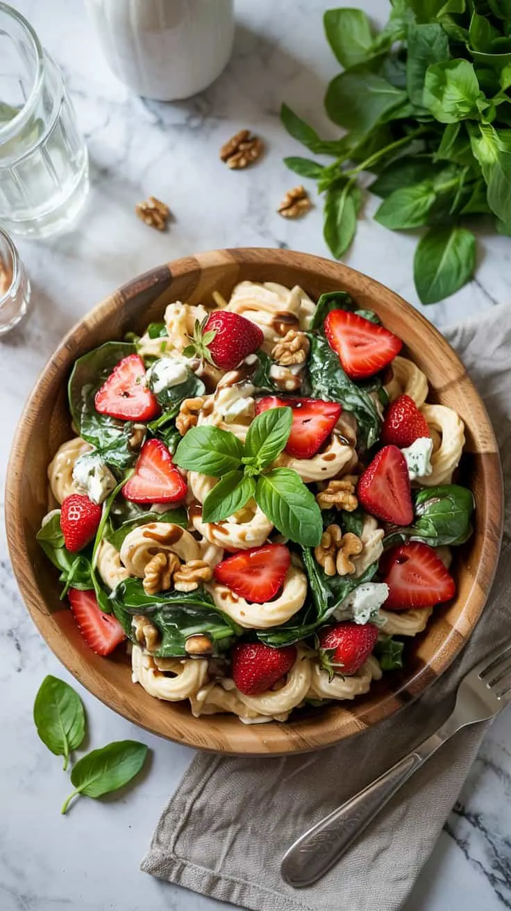 The salad features a harmonious blend of sweet, juicy strawberries, tender baby spinach, and al dente pasta spirals. Creamy, tangy feta cheese balances the fruitiness, while toasted nuts add a delightful crunch. A bright vinaigrette ties all the flavors together, creating a dish that feels both light and fulfilling.