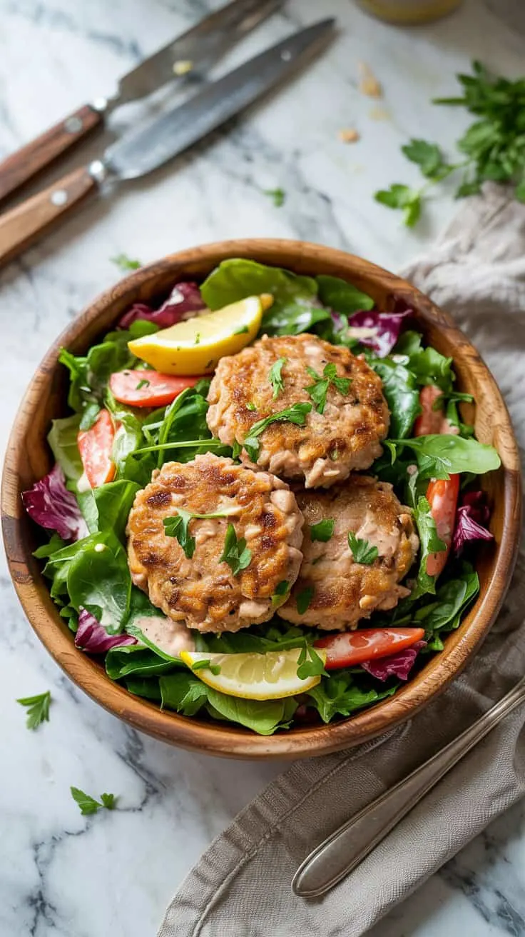 The flavor profile blends savory tuna with bright, zesty notes from fresh herbs and lemon. Creamy and tangy dressing elements balance the dish. The patties provide hearty satisfaction, while the salad contributes refreshing crunch and freshness. Together, they form a harmonious meal where richness meets lightness.